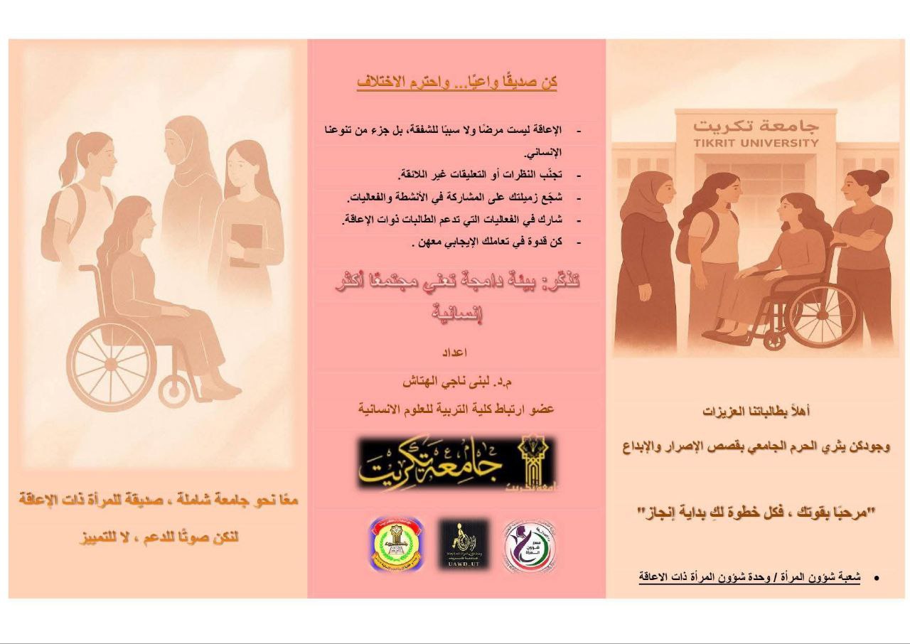 برعاية وإشراف السيد عميد كلية التربية للعلوم الإنسانية الأستاذ الدكتور عماد حميد أحمد، وبتوجيهٍ مباشر من رئاسة جامعة تكريت، اقامت وحدة شؤون المرأة ذات الإعاقة في رئاسة الجامعة بالتعاون مع شعبة النشاطات الطلابية، صباح اليوم الثلاثاء الموافق 21 تشرين الأول 2025، حملةً توعوية متميزة بعنوان: "مرحباً بقوتك، فكل خطوةٍ لكِ بداية إنجاز".