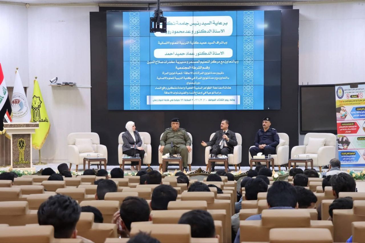 وحدة شؤون المرأة ذات الإعاقة/ شعبة شؤون المرأة _ وحدة شؤون المرأة في كلية التربية للعلوم الانسانية تقيم دورة علمية بعنوان (هشاشة مضاعفة : الظواهر السلبية الخفية وإعادة تشكيل واقع النساء)وبالتعاون مع مركز التعليم المستمر ومديرية مخدرات صلاح الدين وقسم الشرطة المجتمعية وذلك ضمن الخطة التنفيذية للاستراتيجية الوطنية العراقية ٢٠٢٦، اذ أقامت وحدة شؤون المرأة ذات الإعاقة/ شعبة شؤون المرأة _ وحدة شؤون المرأة في كلية التربية للعلوم الانسانية دورة علمية بعنوان (هشاشة مضاعفة : الظواهر السلبية الخفية وإعادة تشكيل واقع النساء .. دراسة نوعية في اوضاع النساء والفتيات ذوات الإعاقة) اليوم الاول من الدورة الموافق يوم الثلاثاء (١٠ /٢ /٢٠٢٦) . و تهدف الدورة إلى تسليط الضوء على مفهوم الهشاشة المضاعفة التي تواجهها النساء والفتيات ذوات الإعاقة، والكشف عن الظواهر السلبية الخفية التي تؤثر في واقعهن الاجتماعي والتربوي والنفسي، فضلاً عن تحليل التحديات البنيوية والثقافية التي تعيق تمكينهن وإعادة تشكيل أدوارهن في المجتمع. كما تناولت الدورة محاور عدة، من بينها الأبعاد الاجتماعية والنفسية والاقتصادية للإعاقة لدى النساء، وآليات الحماية القانونية والاجتماعية، ودور المؤسسات الأكاديمية والمجتمعية في دعم حقوق النساء ذوات الإعاقة وتعزيز اندماجهن في مختلف مجالات الحياة. وتأتي هذه الدورة ضمن سلسلة النشاطات العلمية التي تحرص كلية التربية للعلوم الإنسانية على إقامتها، دعماً للمسيرة الأكاديمية، وتعزيزاً لدور الجامعة في خدمة المجتمع وبناء الإنسان على أسس علمية وقيمية رصينة. السادة المحاضرون في الدورة : ١- الأستاذ الدكتور مثنى مشعان خلف . ٢- الاستاذ الدكتور ميثم علي عباد . ٣- المدرس الدكتورة لبنى ناجي محمد . ٤- المدرس الدكتورة نور سعد حمود . ٥- العميد حماد صالح محيميد . ٦- العقيد الدكتور جاسم محمد حسن . ٧- العقيد محمد مصطفى ثلج . ٨- المقدم الدكتور بهاء عايد عبدالله . ٩- الملازم زينب رشيد لطيف .